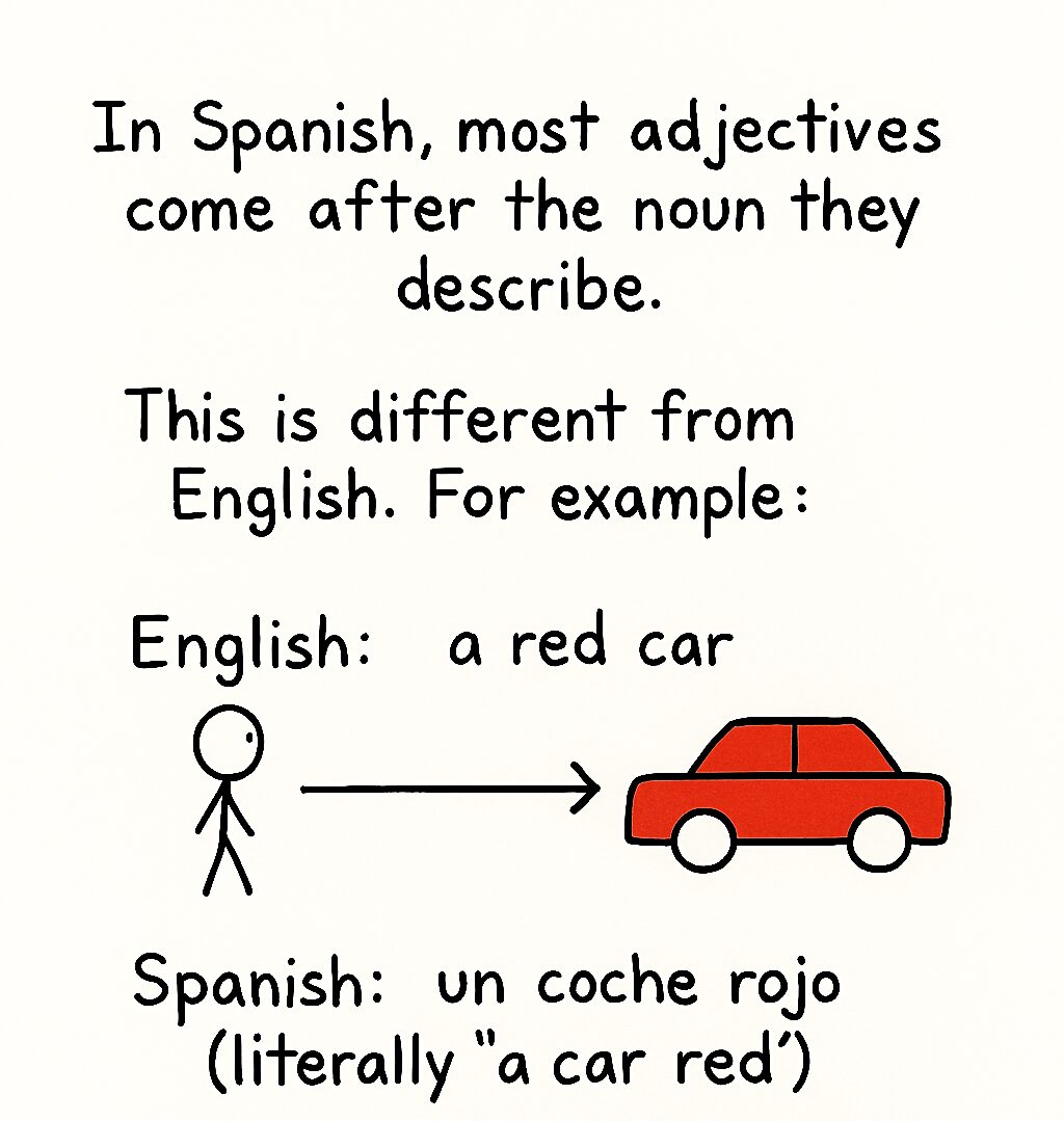 More infoAdjectives in Spanish describe a person, place, or thing just like in English. For example, in English, you might say “a small cat” – small is the adjective describing the cat. In Spanish, you’d say “un gato pequeño”, which literally is “a cat small.” Notice something different? In Spanish, the adjective usually comes after the noun, and Spanish adjectives have to match the noun they describe in gender. Don’t worry, we’ll explain all of this now. Let’s dive in!