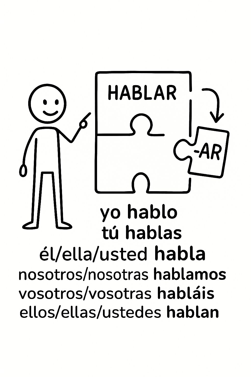 - Use visual cues: Picture the verb stem and its endings like pieces of a LEGO set. The stem is the base piece, and each ending is a piece that snaps on for the different subjects. For example, imagine the root habl- with different colored blocks snapping on for -o, -as, -a, etc. This playful mental image makes conjugation less abstract and more fun.