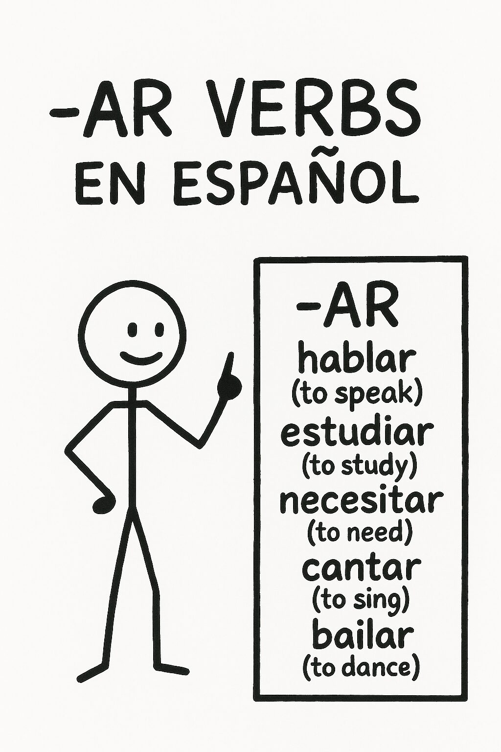 In Spanish, every verb in its infinitive (basic) form ends in -ar, -er, or -ir. For example, hablar means “to talk,” comer means “to eat,” and vivir means “to live.”