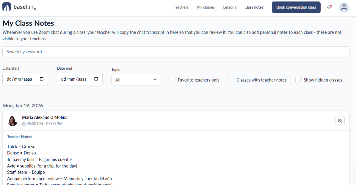 You can also add your own notes after class. This could be anything from grammar reminders to new words you want to practice. Unlike your teacher’s notes, which both of you can see, your personal notes are private and visible only to you.